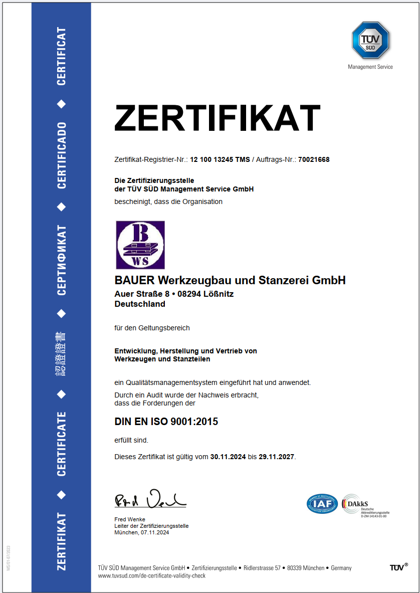 Während des Herstellungsprozesses führen wir serienbegleitende QS-Prüfungen mit Hilfe modernster Technik durch und setzen hier u.A. einen digitalen optischen Projektors ein. Unsere Mitarbeiter und Mitarbeiterinnen „leben“ den Qualitätsgedanken und leisten in unserem nach ISO 9001:2015 zertifizierten Betrieb mit ihrer täglichen Arbeit einen entscheidenden Beitrag zu unserem Erfolg.